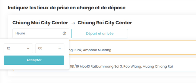 Cliquez sur Départ et Arrivée, puis Confirmer, puis une fois de retour sur le devis, vous pourrez choisir l’heure.